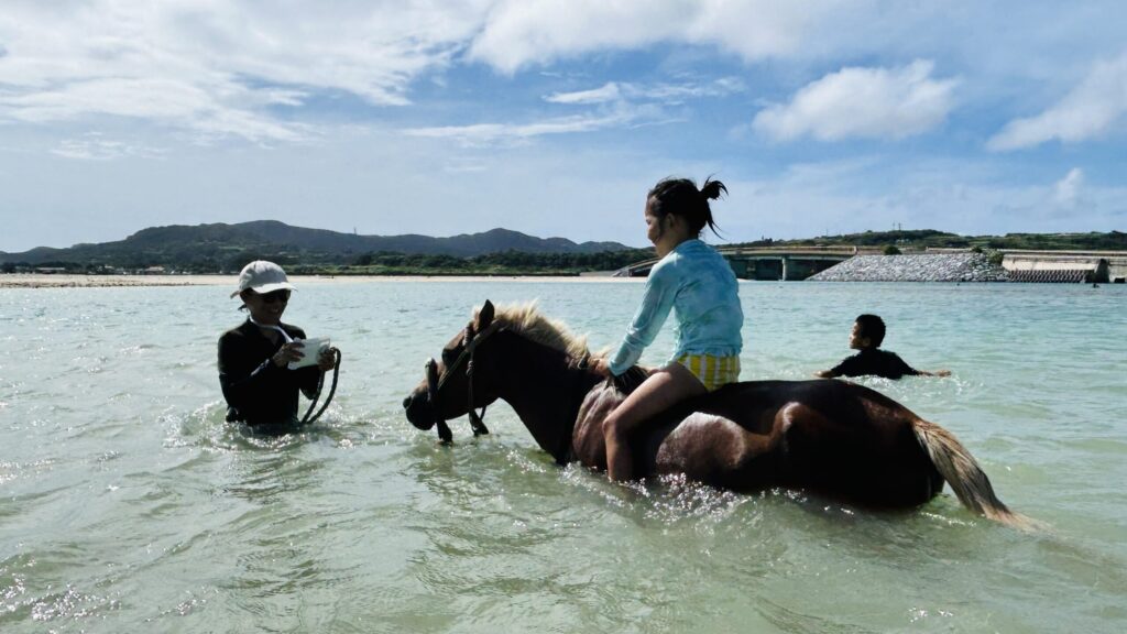 まずはビーチでの乗馬体験コースから始めるのがおすすめ。久米島馬牧場はヨナグニウマが多くいる牧場で、馬が大好きなオーナーが丁寧にサポートしてくれます。鞍を使わずに裸馬に乗る体験もできるので、普通の乗馬より特別感があります。