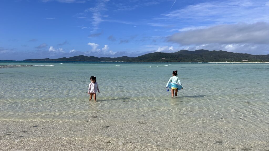 久米島のビーチは遠浅で、砂遊びや干潮時の生き物観察も楽しめます。波も穏やかで、子連れでも安心。小さい子には足を通す浮き輪や腕につける浮き輪、砂遊びセットを持参すると、さらに充実した時間になります。