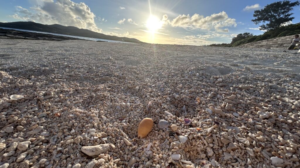 青い海を横目に、気に入った貝殻やサンゴのかけらを拾って砂の上に並べるだけで、自然の美しさがぐっと引き立ちます。